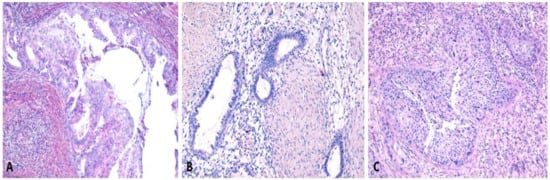 (A–C)—Hyperplastic and neoplastic transformations of ectopic endometrial foci. (A,B) An outbreak of hyperplastic transformed adenomyosis with atypical cellularity. The nucleocytoplasmic ratio is reversed, and the nuclei are hypochromic. The cells of the endometrial glands are organized in several layers. Intramiometrial periglandular stroma is loose, [×100]; (C) Moderately differentiated G2 endometrioid carcinoma area, coexisting with underlying areas of endometriosis, some with hyperplasia with and without atypia, [×200]; classic histological staining HE. HE: Hematoxylin-Eosin.