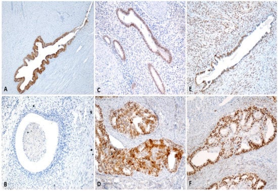 The estrogen receptors (ER) and progesterone receptors (PR) were present at the level of endometrial cells in all evaluated areas (Figure 4C–F). The positive reactivity for both markers in all cases once again demonstrated the endometrial origin.