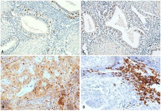 (A–D)—Presence of T lymphocytes in endometriotic foci with or without atypia. (A) Adenomyosis. Immunolabeled T lymphocytes (brown marking) present in the periglandular stroma; (B) hyperplastic transformed adenomyosis, with atypical cellularity. Numerically enlarged, immunolabeled (brown marking) T lymphocytes are present in the periglandular stroma—immunostaining with anti-CD3 antibody, [×200]; (C) endometriosis of the abdominal wall. Immunolabeled B lymphocytes (brown marking) are present in the periglandular stroma; (D) hyperplastic transformed adenomyosis, with atypical cellularity. Immunolabeled B lymphocytes (brown marking) are observed in the periglandular stroma. Immunostaining with anti-CD20 antibody, [×200]. CD3: Cluster of differentiation 3, CD20: Cluster of differentiation 20.