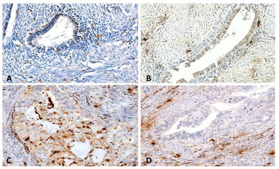 (A–D)—Presence of macrophages and mast cells in the area adjacent to endometriotic foci. (A) Endometriosis of the abdominal wall. Immunolabeled CD68 + macrophages (brown marking) are observed in the periglandular stroma; (B) hyperplastic transformed adenomyosis, with atypical cellularity. Immunolabeled CD68 + macrophages (brown marking) present in the glandular epithelium, periglandular. Immunostaining with anti-CD68 antibody, [×200]; (C) adenomyosis—Tryptase + mast cells, immunolabeled (brown marking), in the periglandular stroma; (D) hyperplastic transformed adenomyosis, with atypical cellularity. Tryptase + mast cells are immunolabeled (brown marking) in the periglandular stroma. Immunostaining with anti-tryptase antibody, [×200]. CD68: Cluster of differentiation 68.