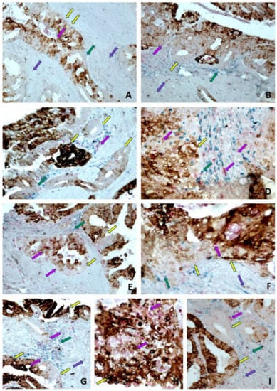(A–I)—Particular, multiple immunohistochemical labeling of hyperplastic transformed adenomyosis and adenomyosis. (A–I) areas of adenomyosis with complex hyperplasia and atypia show a weak glandular epithelium immunolabeled in brown with anti-CK7 antibody, areas of adenomyosis without atypia and normal endometrial epithelium, intensely immunolabeled with anti-CK7 antibody (gal darts). Periglandular inflammatory infiltrate is detected by antibodies: anti-tryptase, which shows mast cells in purple (purple arrows), anti-CD68 antibody, which marks periglandular and intraepithelial macrophages in red-pink (pink arrows), and anti-CD3 antibody, which high-lights lymphocytes T immunolabeled in green (green arrows). CK7: cytokeratin 7, CD34/68: cluster of differentiation 34/68, CD3: cluster of differentiation 3; [×100, ×200].