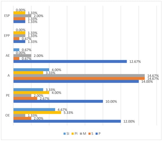 Of the total number of patients included in the study, 22% had spotting (S). Dividing them by groups, they were as follows: 14.67% of patients with A presented S, 2.67% of patients with PE presented S, 2% of patients with OE presented S, 1.33% of patients with ESP presented S, 0.67% of patients with AE and EPP presented S. 23.33% of patients had menorrhagia (M), of which 14.67% of patients with A presented M, 2% of each category: PE, AE and ESP presented M, and 1.33% of each category: OE and EPP presented M. 15.33% of the total patients had primary infertility (PI). Of these, 5.33% of patients with OE presented PI, 4% of patients with PE presented PI, 3.33% of patients with A presented PI, and 1.33% of each category of control groups: EPP and ESP presented PI, and patients with AE did not present PI. Additionally, 12.67% of patients associated with secondary infertility (SI) were as follows: 4.67% of patients with OE presented SI, 4% of patients of A presented SI, 3.33% of patients of PE presented SI, and 0.67% of patients with AE presented SI. The control groups did not present SI (Scheme 1). Comparing the symptoms according to location, we noticed that A was associated with most cases that showed P (14% of them)/S (14.67% of them)/M (14.67% of them). In total, 12.67% of patients with AE had moderate or severe P. Additionally, 10% of patients with PE had moderate or severe P. 12% of patients with OE had moderate or severe P, but we found that 5.33% of them were associated with PI and 4.67% of them were associated with SI, representing the highest percentages associated with the categories studied.
