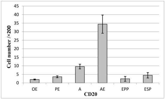 The average density of CD20 + type B lymphocytes varied as follows: AE: 34.42 (±5.33 cells/× 200), A: 9.59 (±1.38 cells/× 200), ESP: 4.48 (±1.6 cells/× 200), PE: 3.6 (±0.56 cells/× 200), EPP: 2.39 (±1.42 cells/× 200) and OE: 2.01 (±0.28 cells/× 200). The number of B lymph cells revealed significant differences between all the studied groups [F(5,149) = 733.85, p < 0.001], and post hoc comparisons using the Tukey HSD test indicated a difference between the number of CD20 + cells of the A/AE and all of the other groups (p < 0.001), with a gradual increase from OE to PE, to A and AE. There were also significant differences between the number of CD20 + cells of the EPP and ESP (p = 0.021) (Scheme 5).