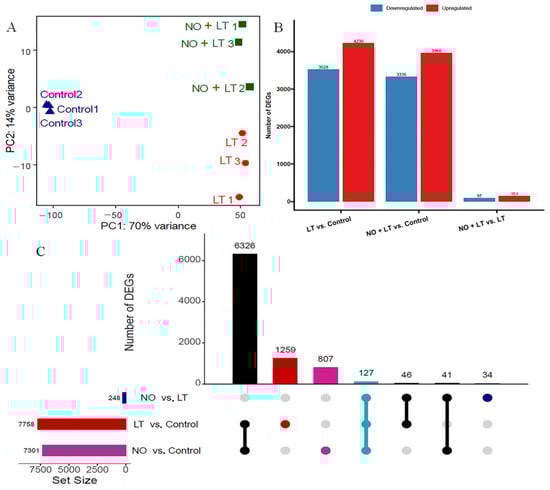 The differentially expressed genes (DEGs) in cucumber seedlings as influenced by nitric oxide (NO) pretreatment under low temperature (LT) stress. (A) Principal Component Analysis (PCA) of log2-transformed normalized read counts of each RNA-seq dataset of Control, LT, and NO + LT; (B) number of DEGs in LT vs. Control, NO + LT vs. Control and NO + LT vs. LT; (C) UpSet diagram for the DEGs obtained from the comparison of the three groups, the figures showing the sizes of DEG sets (left) and the combination matrix at the bottom shows the intersections between the sets and the bar above it encodes the size of the intersection.