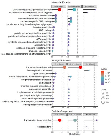 In order to understand the function of DEGs in-depth, the DEGs with a corrected p-value less than 0.01 (padj < 0.01) were chosen for GO enrichment analysis. The results showed that there were 4609, 4915, and 159 DEGs that obtained GO annotations in the three comparisons of LT vs. Control, NO + LT vs. Control, and NO + LT vs. LT, respectively. In addition, 2439, 2632, and 81 DEGs were enriched in the biological process (BP), 835, 863, and 44 DEGs were enriched in cellular component (CC), and 3320, 3428, and 116 DEGs were enriched in molecular function (MF) in the three comparisons, respectively. Furthermore, the MF contains the most DEGs, followed by BP, and the CC with the least DEGs. Taking p < 0.05 as the criterion of significant GO enrichment, the significantly enriched GO terms of each comparison were selected and plotted as a bubble diagram (Figure 3). GO terms associated with DNA-binding transcription factor activity, oxidoreductase activity, transmembrane transporter activity, sequence-specific DNA binding, transferase activity, ADP binding, protein serine/threonine phosphatase activity in MF; transmembrane transport, signal transduction, serine family amino acid metabolic process in BP; and transcription factor complex in CC were significantly enriched in LT vs. Control. Moreover, DEGs including DNA-binding transcription factor activity, transmembrane transporter activity, sequence-specific DNA binding, transferase activity, transferring hexosyl groups, protein serine/threonine kinase activity, protein serine/threonine phosphatase activity in MF; transmembrane transport, serine family amino acid metabolic process, drug transmembrane transport, nucleosome assembly, L-phenylalanine catabolic process, photosynthesis, light harvesting in BP; and transcription factor complex in CC were predominantly enriched in NO + LT vs. Control. In addition, the GO terms including DNA-binding transcription factor activity and oxidoreductase activity in MF; DNA replication initiation in BP; and transcription factor complex, replication fork in CC, were significantly enriched in NO + LT vs. LT.