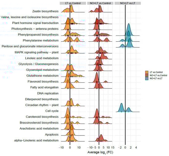 The RNA-seq technology has the advantage of global representation and precise measurement of the expression level of each gene in a sample by mapping short DNA sequences on a reference []. Previous studies intended to identify underlying molecular genetics pathways imparting LT stress tolerance using RNA-seq focusing on the seedling stage of various plants [,]. In this study, a total of 7758, 248, and 7301 DEGs were found in LT vs. Control, NO + LT vs. LT, and NO + LT vs. Control, respectively (Figure 2). Previous findings on LT tolerance and NO-induced LT tolerance also revealed a relatively large number of DEGs in melon []. Furthermore, a comparative analysis of DEGs of NO + LT vs. LT and common (the genes that differentially expressed in both LT vs. Control and NO + LT vs. Control.) revealed 121 DEGs were exclusively present in NO + LT vs. LT and 127 DEGs were commonly involved in both NO + LT vs. LT and common (Figure 2). This suggested that the presence of these genes may confer tolerance to cucumber during exposure to LT stress. Similar results were also found in NO-induced LT tolerance in melon []. These results suggested that the plants may have both the same regulatory and different regulatory pathways when responding to LT stress alone and combined treatment with exogenous NO and LT stress.