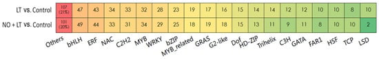 The types and numbers of TF families in the DEGs obtained by LT vs. Control and NO + LT vs. Control, respectively. Color changes represent the changes in gene number.