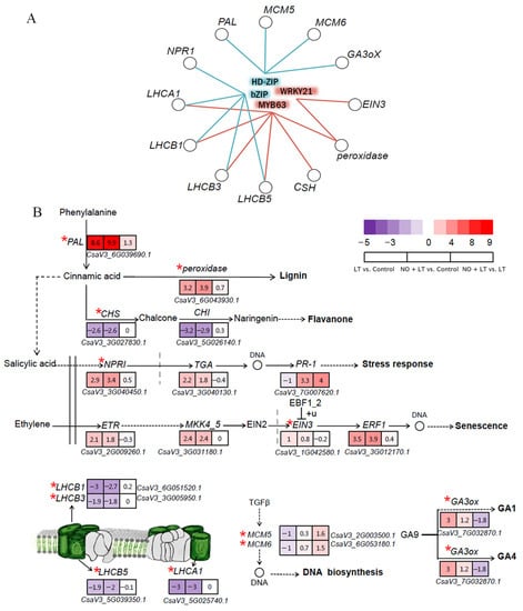 (A) A diagram of TFs regulatory network. Blue represents TFs enriched only after NO application under LT stress. Red represents the TFs enriched in both NO and LT. (B) Schematic diagram of main pathways and key gene transcript abundance after exogenous application of NO. The Heatmap shows the level of gene expression in different comparisons. The color from red to purple represents the DEGs up-regulated to down-regulated. The gene ID is at the bottom. ‘*’ represents the genes regulated by transcription factors.