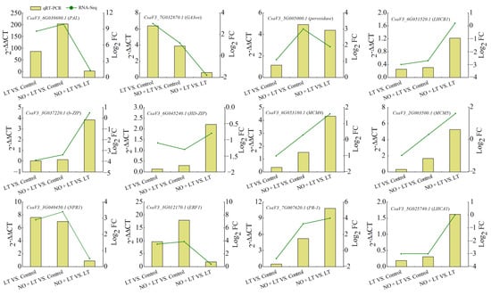 To further validate our transcriptome results, transcripts of 12 key genes involved in plant hormone signal transduction, phenylalanine metabolism, and cell cycle were analyzed by qRT-PCR assays. The expression levels of these 12 genes under each treatment were calculated based on the 2−△△CT. Comparisons of the relative expression levels of these genes evaluated by the Log2 (Fold Change) and qPCR methods are shown in Figure 7. The qRT-PCR results were highly consistent with the transcriptome data, suggesting high confidence in the RNA-seq data and supporting the mechanisms of NO-induced chilling tolerance in cucumber seedlings.