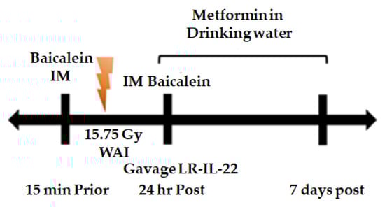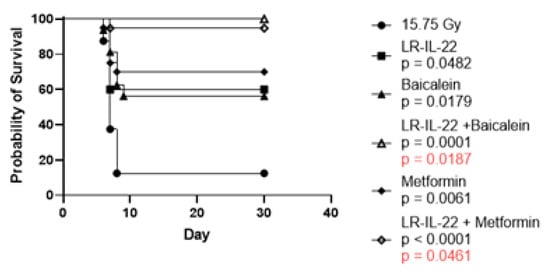 Radiation mitigators included LR-IL-22 at 109 cells in 200 µL of PBS gavaged 24 h after irradiation, baicalein 50 mg/kg (Millipore Sigma, St. Louis, MO, USA) injected intramuscularly 15 min before and 24 h after irradiation and metformin 60 µM in drinking water for seven days, which was initiated immediately following irradiation (Millipore Sigma, St. Louis, MO, USA).
