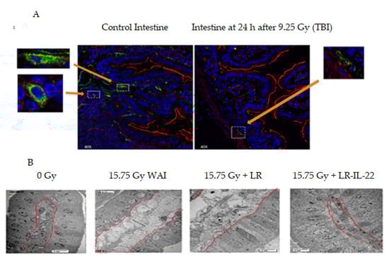Effect of 9.25 Gy total body irradiation (TBI) or 15.75 Gy whole abdomien irradiation (WAI) observed as destruction of microvascular endothelial cells and cell swelling of the lamina propria including the intestinal multivasculature in the intestinal crypts. (A) Control mouse ileum and at 24 h after 9.25 Gy irradiation: Inserts are green = CD31 positive endothelial cells, red = collagen and blue = DAPI (×100). (B) Electron micrographs of intestinal villi at 48 h after 15.75 Gy WAI showing cell swelling of lamina propria (×1000). Both 9.25 Gy TBI and 15.75 Gy WAI cause destruction of microvascular endothelial cells and cellular swelling of the lamina propria including the intestinal multivasculature within the crypts. The red line in 2B shows the division of the intestinal villus cells from underlying lamina propria.