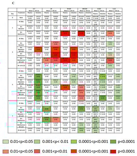For the Luminex data, analyses were done separately for each cytokine and tissue (plasma or intestine) combination. In these analyses, cytokine expression was summarized in each subgroup with mean ± standard deviation (SD) (n = 5). At each day of measurement, we compared each treatment group with day 0 data (i.e., non-irradiation control). We also compared the daily data for each group with the irradiation only control on that same day. All comparisons were done based on a one-way ANOVA model, followed by a t-test using ESTIMATE statement in Proc GLM of SAS 9.4 (SAS Institute Inc., Cary, NC, USA). We used the one-way ANOVA test, because the treatments on different days were not identical. In these analyses, a value of p < 0.05 was regarded as significant. As these were exploratory analyses, we did not adjust p-values for multiple comparisons.