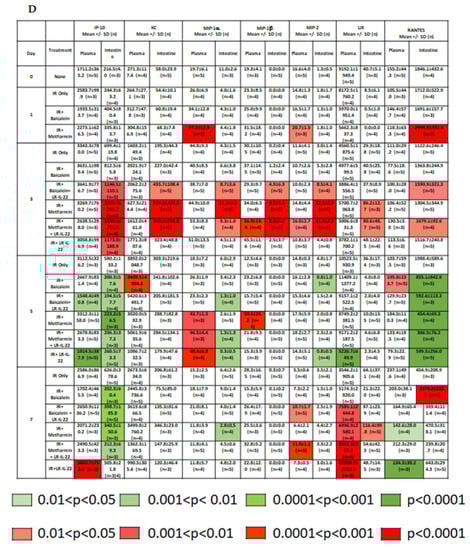 Decreases in some cytokine levels were also detected with both the intestine and plasma in mice treated with LR-IL-22 combined with a systemic small molecule mitigator. Decreases in plasma levels of cytokine in mice treated with LR-IL-22 and either bacailein or metformin relative to mice treated with irradiation alone on a given day (Day 1, 3, 5, 7 after irradiation) were observed with TNF-a, IL-3, IL-5, MCP-1, GM-CSF, G-CSF, IP-10, IL-9, and Eotaxin. Decreases in intestinal levels of cytokine in mice treated with LR-IL-22 and either Baicalein or Metformin relative to mice treated with irradiation alone on a given day were observed with TGF-b, TNF-a, IL-1a, IL-1b, IL-5, IL-12 (p70), IL-7, LIF, M-CSF, G-CSF, IL-15, IP-10, MIP-1a, RANTES, IL-2, IL-9, and IL-10 (Figure 3 and Supplemental Figures S1 and S2).