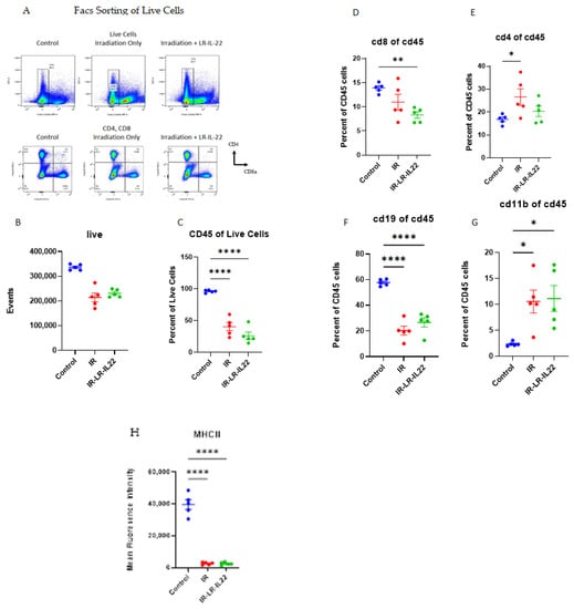 The strategy for the flow cytometry gating was to gate the spleen cells for living cells. The living cells were then gated for CD45+ cells which were then analyzed for the presence of CD4, CD8, CD19 or CD11b. Single cell suspensions were resuspended in FACS buffer and treated with Fc Block (BDB553142, Fisher Scientific, Waltham, MA, USA) [37] prior to monoclonal antibody staining. OneComp eBeads Compension Beads (01-111-41, Invitrogen, Waltham, MA, USA) were utilized for antibody compensation control samples. Fluorophore-conjugated antibodies used are as follows: Aqua Live/Dead Fixable Aqua Dead Cell Stain Kit purchased from Biolegend (423106), CD19 (Fisher BD, ID3, BDB749027), CD45 (Biolegend, 30-F11, 103137), CD8a (Biolegend, 53-6.7, 100740), CD11b (Fisher BD, M1/70, BDB563015), CD4 (Fisher BD, GK1.5, BDB563232), TCR γδ (Biolegend, UC7-13D5, 107504), TCRβ (Fisher BD, H57-597, 560705), and MHCIL (Biolegend, M5/114.15.2, 107652). Lymphocytes are defined as live CD45+ gated CD4+ or CD8a+. Myeloid cells were gated on live CD45+ cells. Flow cytometry analysis was performed on a Cytek Aurora using FloJo software. Five thousand events were recorded for compensation controls. 100,000 events were recorded for unstained sample, 40,000 events were recorded for Live-dead, and 500,000 events were recorded for experimental samples [40]. Data are for five mice per group comparing control unirradiated to 8.75 Gy TBI irradiated, or 8.75 Gy irradiated, then gavaged with LR-IL-22 at 24 h. Results are for spleens removed at day 21 after irradiation.