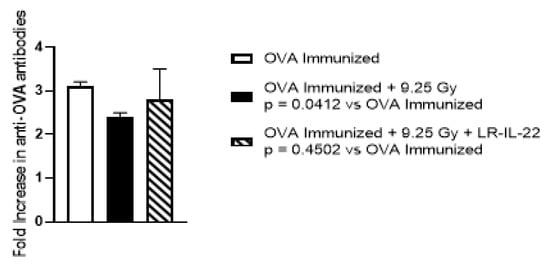 To test for radiation-induced changes in immunity, we utilized the chicken ovalbumin mouse immunization model [28] and explored whether memory T-cells and memory B-cells/and/or lymphocyte progenitor cells could be used as a measure of the effectiveness of LR-IL-22 on immune reconstitution. Mice were immunized with OVA [28] and were measured at 30 and 60 days after immunization, when control mice demonstrated significant elevation in antibody to OVA. Experimental mice were subjected to 9.25 Gy TBI (LD70/30 dose). This dose allows us to test the ability of LR-IL-22 on protecting the immunity of the mice under extreme conditions where 70% of the mice will die of hematopoietic syndrome. We sacrificed the mice at day 11 before the mice developed hematopoietic syndrome around day 14, at which time they would have to be euthanized. At 24 h after irradiation, mice were either left untreated or were gavaged with LR-IL-22. Untreated mice, as well as the treated groups, were then followed for a time course and magnitude of recovery of humoral immunity as measured. Immunized mice that were treated with LR-IL-22 demonstrated a significant increase in the level of antibody to OVA compared to non-treated animals (Figure 7). These data support a physiological effect of LR-IL-22 on stimulating the function of the immune system following TBI.