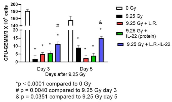 In the bone marrow, LR-IL-22 gavage increased the number of hematopoietic progenitor cells forming CFU-GEMM in the femoral bone marrow of TBI mice measured at days one and five after 9.25 Gy TBI (Figure 8). Gavage of LR-IL-22, but not LR, and not IL-22 protein increased levels of colony forming progenitor cells as an indication of the integrity of the bone marrow microenvironment and hematopoietic stem cells (Figure 8). There was a correlation of the clear increase in survival of irradiated mice following the administration of LR-IL-22 by gavage, with data showing an increase in the numbers of bone marrow colonies forming progenitor cells (Figure 8).