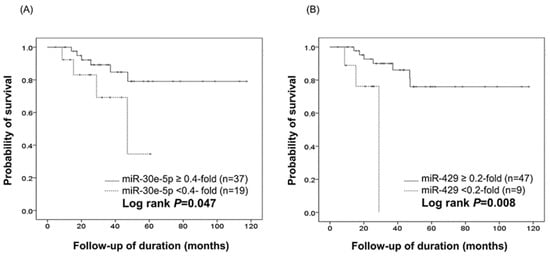 Overall survival (OS) analysis of the 56 patients, regardless of metastasis, was performed according to the expression levels of each of the four selected miRNAs. During the follow-up period, ten patients died of disease, and all were from the SqC-M group. Kaplan–Meier survival analysis according to miR-30e-5p and miR-429 expression (Figure 3) demonstrated that downregulation of miR-30e-5p (<0.4-fold) and miR-429 (<0.2-fold) was significantly associated with shorter OS (miR-30e-5p, OS: 69.2% vs. 86.0%, 28.1 ± 15.7 months vs. 42.0 ± 26.7 months, log rank = 0.047; miR-429, OS: 66.7% vs. 85.1%, 20.5 ± 7.6 months vs. 42.2 ± 25.9 months, log rank = 0.008). MiR-22-3p and miR-134 did not show significant difference in OS analysis (Figure S1).