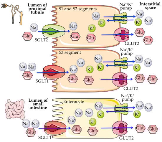 SGLT1 is mainly expressed in the brush border of the small intestine, where it translocates one D-glucose/galactose molecule together with two sodium ions from the diet into mature enterocytes, being responsible for the intestinal absorption of glucose and galactose []. Moreover, SGLT1 also behaves as a water and urea channel, which is important for the absorption of water by passive transport in the small intestine [,]. SGLT2 is mostly located in the luminal membrane of the S1 and S2 segments of the renal proximal convoluted tubule, co-transporting one D-glucose molecule together with one sodium ion from the glomerular filtrate into the proximal tubule epithelial cells, and being responsible for the reabsorption of ~ 90% of the filtered glucose, while the remaining ~ 10% is reabsorbed by SGLT1 in the S3 segment, where there is less luminal glucose []. This exchange alters the glucose concentration inside the cell, being passively transported through the basolateral side of the cell via facilitative glucose transporters (GLUT) into the interstitial space and subsequently to the bloodstream (Figure 1) [].