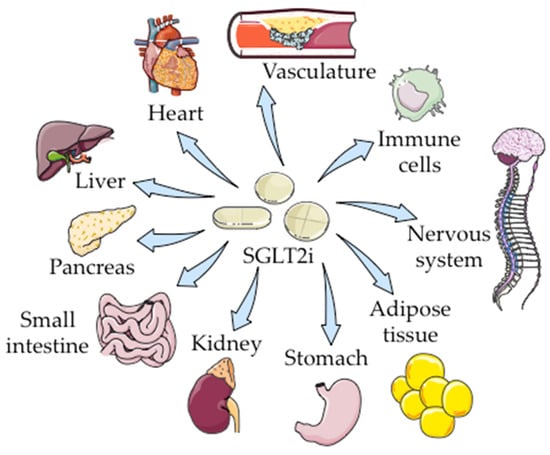 Although the first interest in SGLT2i was their glucose-lowering capacity, lately there have been described pleiotropic effects of SGLT2i in a wide range of targets throughout the body (Figure 2). Using different experimental approaches and in different scenarios, SGLT2i have been shown to participate in the regulation of osmotic natriuresis and diuresis [,], hypertension [], glucagon [,] and energy metabolism [,,,,], mitochondrial function and biogenesis [,,,,,], autophagy [,,,,,,,], oxidative stress [,,,,,], fibrosis [,,,,], apoptosis [,,,,,,,], endoplasmic reticulum stress [,,,,,], or inflammation [,,,,,,,], which opens a window to explore new uses of these drugs to treat other pathologies.