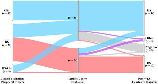Diagnostic yield and disease reclassification. Patients are initially classified based on the clinical suspicion raised by referring physicians (left node). The clinical diagnosis was reframed during pre-WES consultation (middle node). All the patients underwent genetic testing with WES that allowed us to confirm or reclassify the clinical diagnosis (right node). GS, Gitelman syndrome; BS, Bartter syndrome; Other: genetic diagnosis outside BS and GS; Negative: patients without pathogenic variants.