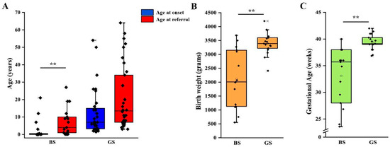 Clinical features of patients according to genetic diagnosis. (A) Age at onset and age at referral for genetic testing in patients with a molecular diagnosis of BS and GS. (B) Birth weight in patients with a molecular diagnosis of BS and GS. (C) Gestational age at birth in patients with a molecular diagnosis of BS and GS. Individual scores are shown as ◆. ** p value < 0.001. GS, Gitelman syndrome; BS, Bartter syndrome.