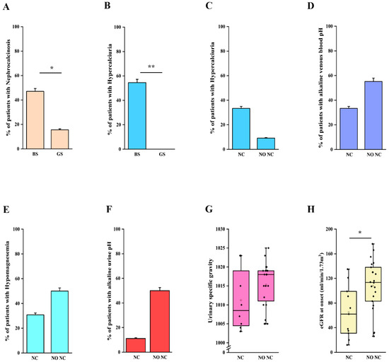 We then analyzed clinical and laboratory features of patients with a molecular diagnosis of BS and GS in order to assess genotype-phenotype correlations. Detailed information is reported in Table 2. Although patients with BS showed a significantly lower age at onset in comparison to patients with GS (2 months vs. 7 years, p < 0.001; Table 2, Figure 2A), eight patients with a molecular diagnosis of GS were younger than 3 years at onset and 15 were younger than 6 years (Table S4). The age at molecular diagnosis was higher than the age at onset in both BS and GS groups, pointing to significant delay in obtaining a conclusive diagnosis (Figure 2A). According to the literature, gestational age and weight at birth were lower in patients with BS in comparison to patients with GS (Table 2, Figure 2B,C). Overall, premature birth and low birthweight (LBW) were observed in 11 and 10 patients, respectively (Table S2). Of note, patients with GS were all born at term and only one showed LBW (Table S2). Among patients with BS, term birth and normal birth weight were observed in 4/15 (26.7%) and 6/15 (40%), almost exclusively in patients with BS3. Patients with a genetic diagnosis of BS showed higher serum bicarbonate levels in comparison to patients with GS (32 vs. 28 mmol/L, p < 0.05; Table 2). On the other hand, venous blood pH and serum potassium levels were not significantly different (Figure S1A–C, Table 2). Despite patients with GS exhibiting significantly lower serum magnesium levels (1.6 vs. 1.95 mg/dL, p < 0.001; Figure S1D), 25% of patients with BS showed hypomagnesemia (Table 2). In addition, 3 over 4 (75%) of these patients were BS3. Patients with GS showed a higher urinary specific gravity in comparison to patients with BS (1018 vs. 1005, p < 0.001; Figure S1E, Table 2), suggesting the conservation of the ability to concentrate urine in the former group. We did not observe any significant difference in urinary pH (Figure S1F, Table 2). Although patients with BS showed a higher frequency of nephrocalcinosis (8/17, 47.1%), it was observed also in 5/32 (15.6%; p < 0.05) of patients with GS (Figure 3A, Table 2). Of note, no patients with BS and nephrocalcinosis had a molecular diagnosis of BS3. Hypercalciuria (defined as urinary calcium-to-creatinine ratio >0.2 mg/dL in adults or total urinary calcium excretion >4 mg/kg/die in children or adults) was observed in 6/11 (54.4%) patients with BS, while it was completely absent in patients with GS (Figure 3B, Table 2). Hypercalciuria was reported only in 4/12 (33.3%) patients with nephrocalcinosis, irrespective of the genetic diagnosis. This frequency was not statistically different from that observed in patients without nephrocalcinosis (Figure 3C). Similarly, the frequency of alkaline venous blood pH (venous blood pH ≥ 7.45), hypomagnesemia (serum magnesium <1.7 mg/dL), alkaline urinary pH (urinary pH ≥ 7.5) and urinary specific gravity did not differ between patients with or without nephrocalcinosis (Figure 3D–G). The only parameter that significantly differed between the two groups of patients was estimated glomerular filtration rate (eGFR) at onset (Figure 3H, p < 0.05).