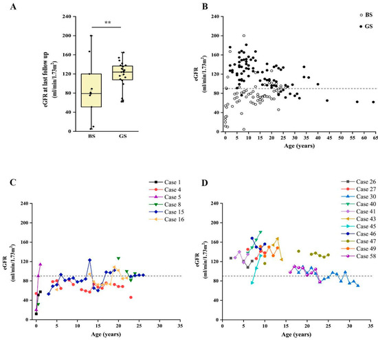 Patients with BS showed a significantly lower eGFR at onset, in comparison to patients with GS (31.5 vs. 118.5 mL/min/1.73 m2; p < 0.001). By analyzing the time-course of eGFR over time, we observed that patients with BS showed flattened eGFR curves, frequently ranging below the limit of 90 mL/min/1.73 m2, even in childhood and adolescence (Figure 4B and Figure S3). Conversely, eGFR was above the normal value of 90 mL/min/1.73 m2 in most patients with GS, showing a decline suggesting CKD only after puberty (Figure 4B). This trend was confirmed by analysis in patients with more than three eGFR measures during follow up (Figure 4C,D).