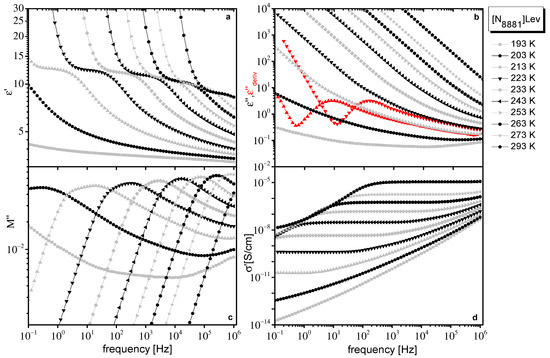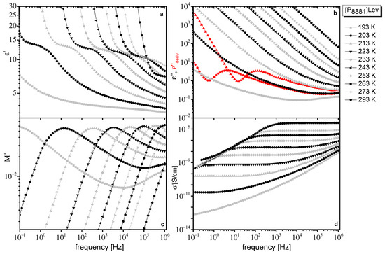 In Figure 1 and Figure 2, different representations of dielectric data at various temperatures obtained for [N8881]Lev and [P8881]Lev, respectively, are presented. Although quantities in different representations of dielectric data are interrelated and contain equivalent information, dielectrically active processes of ILs are differently emphasized in each representation, giving complementary information, making their separate discussions helpful.