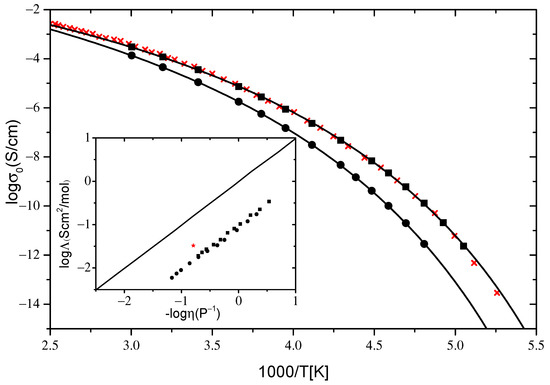 Arrhenius diagram of conductivity σ0 [S/cm] for [P8881]Lev (squares) and [N8881]Lev (circles) IL systems. The solid lines are VFT fits to the data. The red crosses are reproduced data from [25] for conductivity of [N8881]NTf2 IL system. The inset shows a Walden plot for the systems under investigation and the [N8881]NTf2 IL system (red star) along with the “ideal” Walden line (KCl aqueous solution).