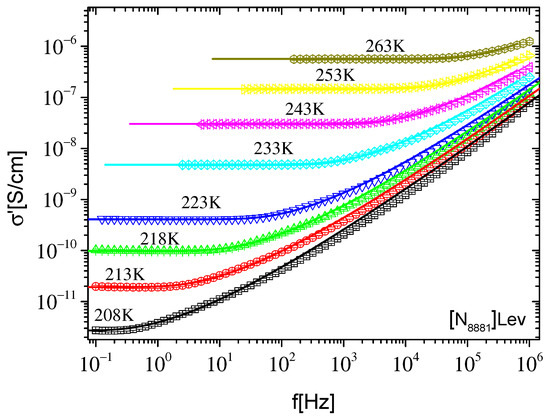 Real part of conductivity σ′ as a function of frequency f at different temperatures, indicated on the plot, for [N8881]Lev. The lines are best fits of the expressions of the original RBM performed in the frequency region of the dc–ac transition and extrapolated to the whole frequency range.
