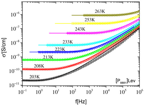 Real part of conductivity σ′ as a function of frequency f at different temperatures, indicated on the plot, for [P8881]Lev. The lines are best fits of the expressions of the original RBM performed in the frequency region of the dc–ac transition and extrapolated to the whole frequency range.