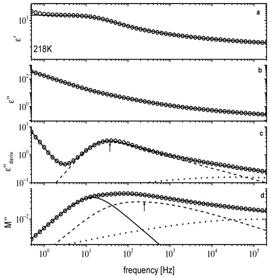 For both IL systems under investigation, the main relaxation process is described by a Cole–Davidson (C–D) function (H–N with α = 1) with a b shape parameter equal to 0.4, while Δε of the relaxation decreases from 8.1 to 5.8 (208 to 263 K) and from 9.4 to 5.4 (198 to 263 K) for [N8881]Lev and [P8881]Lev, respectively. The contribution, observed as a kink at high frequencies, was modeled by a Cole–Cole (C–C) function with a αCC parameter close to 0.3. The latter process is ascribed to secondary relaxations observed in ILs [26,54,55] and will not be discussed further here. However, from Figure 6c and Figure 7c, it is obvious that the secondary dielectric relaxation significantly influences the dielectric response up to 0.5 KHz, and 5 KHz for the [N8881]Lev and [P8881]Lev ILs, respectively. Dielectric data in all the formalisms can be reproduced assuming the contributions of the relaxation processes obtained by fitting of the and the dc conductivity. So, dielectric data in different representations (ε′, ε″, , M″) at 218 K for [N8881]Lev and [P8881]Lev are shown in Figure 6 and Figure 7, respectively. The parameters obtained from the fitting of data were used to reproduce data in all other representations. For the reproduction of data in different formalisms, additional terms were used. For the reproduction of ε′ (f) (Figure 6a and Figure 7a), the instantaneous permittivity, ε∞, for ε″ (f) (Figure 6b and Figure 7b), conductivity term (), and for M″(f) (Figure 6d and Figure 7d), both ε∞ and the conductivity term were added. The values used are those obtained directly from dielectric data. For both ILs under investigation, the dielectric data are perfectly described in all the representations assuming the contributions of two relaxation processes and of dc conductivity as shown in Figure 6 and Figure 7.