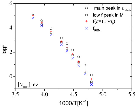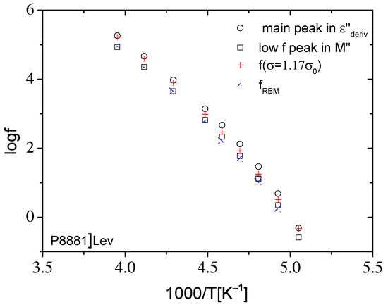 Arrhenius diagram of the characteristic frequencies of the main peak in and of the low frequency peak in M″, as well as of the frequency at which σ′ = 1.17σ0 and of the characteristic frequency fRBM obtained by fitting the expression of the original RBM to σ′(f) data for [P8881]Lev presented in Figure 5.