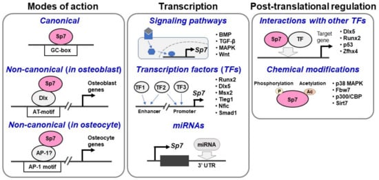 Current understanding of Sp7 actions and regulations. Modes of Sp7 action (left), transcriptional regulations of Sp7 (middle), and post-translational regulations of Sp7 (right) activities are illustrated.