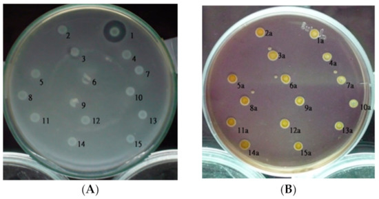 Bacteriocin of Pectobacterium carotovorum subsp. carotovorum. (A) The bacteriocin test was performed by soft agar overlay. (1) Wild-type rif-TO6 Pcc strain, (2–15) transposon Tn5 insertional mutants: 2—TT6-1, 3—TT6-3, 4—TT6-2, 5—TT6-4, 6—TT6-5, 7—TT6-6, 8—TT6-9, 9—TT6-12, 10—TT6-13, 11—TT6-14, 12—TT6-19, 13—TT6-21, 14—TT6-22, and 15—TT6-25. (B) Screening of the wild-type rif-TO6 and transposon Tn5 insertional mutants with Drigalski medium. If the strain is Pcc, the medium will be golden yellow, but if it is an Escherichia coli colony, the medium will be blue. (1) Wild Type rif-TO6 Pcc strain, (2–15) transposon Tn5 insertional mutants 2—TT6-1, 3—TT6-3, 4—TT6-2, 5—TT6-4, 6—TT6-5, 7—TT6-6, 8—TT6-9, 9—TT6-12, 10—TT6-13, 11—TT6-14, 12—TT6-19, 13—TT6-21, 14—TT6-22, and 15—TT6-25.