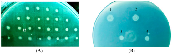 The size of the inhibitory zone around each isolate was compared to that of rif-TO6 in a bacteriocin assay. According to this evidence of mutation (Figure 1A), the absence of inhibitory zones confirmed that the mutant colonies’ transposon Tn5 had been inserted into LMW bacteriocin-related genes. The wild-type rif-TO6 and Tn5 insertional mutants that underwent bacteriocin testing verified that the strains are Pcc, according to the results from the Modified Drigalski medium (Figure 1B).