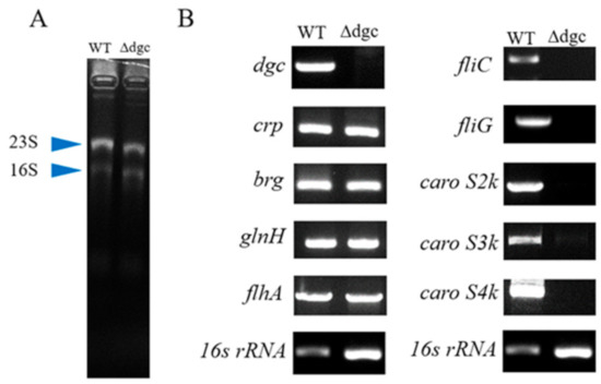 Transcriptional analysis of bacteriocin genes and regulatory genes by two-step endpoint RT-PCR. (A) 16s RNA expression of the wild-type 89-H-rif-12 and the dgc defective mutant. (B) Shown are gel electropherogram of RT-PCR products exhibited by the wild-type and dgc defective mutants.