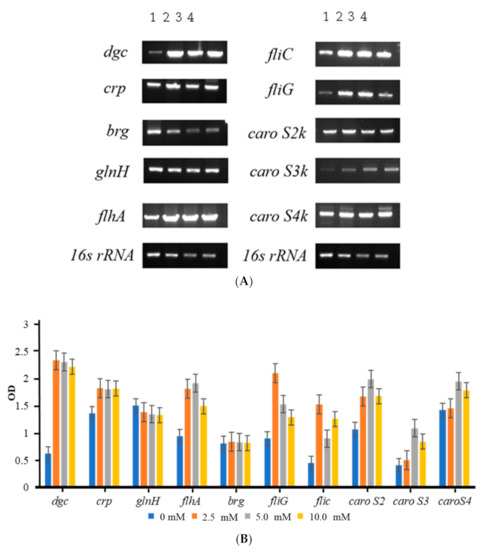 The ability of the induced cells to create, regulate, and release bacteriocin was studied using a two-step endpoint reverse transcriptase polymerase chain reaction (endpoint RT-PCR). The gene segments 16s RNA, dgc, crp, brg, glnH, flhA, fliC, fliG, caroS2k, caroS3k, and caroS4k were successively amplified (Figure 4A).