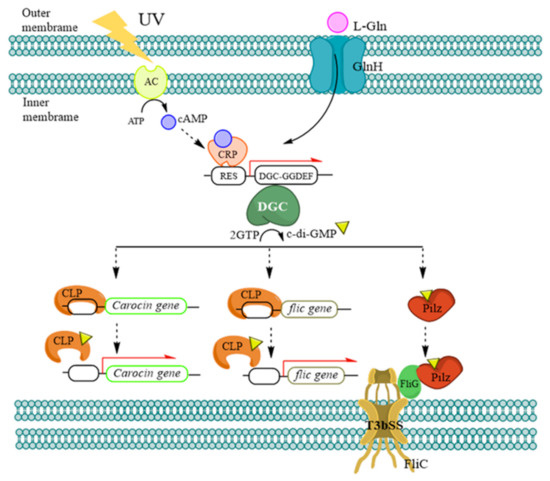 When bacteria are exposed to various environmental conditions, they develop a number of transmission pathways in their cells that produce physiological changes involving a wide range of proteins and chemicals. The cyclic diguanylate monophosphate (c-di-GMP), which connects external stimuli to cells in signal transmission, is a common and important secondary signaling component in many bacterial species, including Pectobacterium carotovorum subsp. carotovorum (Pcc) [1,2,3,4]. A class of enzymes known as diguanylate cyclase (DGC) with a conserved GGDEF motif synthesizes this twofold symmetric molecule at the intracellular level from two molecules of guanosine triphosphate (GTP) [5,6]. Diguanylate cyclase has been demonstrated to control a range of cell activities by producing c-di-GMP. Cell cycle regulation, adhesion, biofilms, motility, toxicity, and cellulase modulation are all regulated by changes in c-di-GMP concentrations [7,8,9]. To regulate a wide range of cellular processes, c-di-GMP must first bind to protein receptors and then interact with downstream receptors.