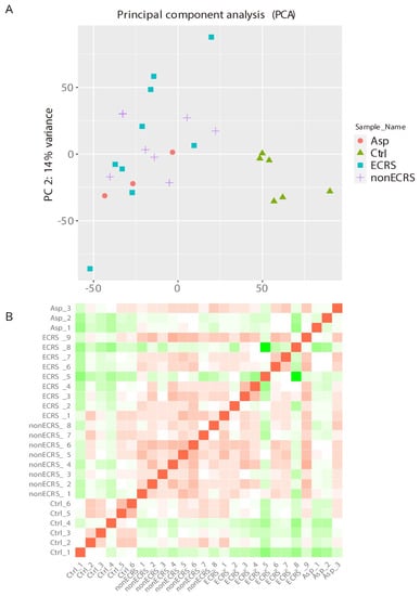 PCA was performed among all groups and revealed that the control group was clearly segregated from the other groups, but ECRS, nonECRS, and Asp were not segregated from each other (Figure 1A). A heatmap of the correlation matrix also clarified the difficulty of the segregation among the three CRSwNP groups (Figure 1B).