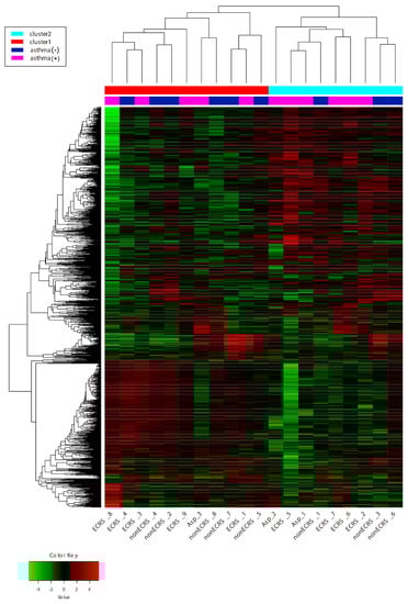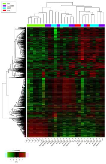 Chronic rhinosinusitis (CRS) is a chronic inflammatory upper airway disease with a high symptom burden, including nasal congestion, smell disorders, nasal discharge, and facial pain/pressure [,]. Based on the presence or absence of nasal polyps, CRS can be classified as without nasal polyps (CRSsNP) or with nasal polyps (CRSwNP), which have distinct inflammatory profiles and pathogenesis. CRS can be subclassified into further categories by its underlying cellular and molecular pathophysiologic mechanisms [], and CRSwNP can also be subclassified into ECRS and nonECRS in terms of the degree of eosinophilic infiltration of sinonasal tissue []. Compared with nonECRS, which is supposed to be characterized by Th1-dominant inflammation, ECRS is a phenotype of CRSwNP characterized by Th2-dominant inflammation, which is difficult-to-treat and leads to poorer surgical outcomes [,]. Additionally, ECRS patients with comorbid aspirin intolerant asthma (AIA) are thought to have more difficult-to-treat CRS due to more severe type 2 inflammation [,]. Therefore, the type of inflammation in CRSwNP is thought to be a key factor in classifying CRSwNP as a difficult-to-treat CRS. Currently, JESREC criteria are used to classify ECRS into mild, moderate, and severe ECRS []. From a transcriptome analysis of nasal polyps, it was certified that nasal polyps can be segregated into two major endotypes showing a type 2 or non-type 2 endotype []. However, a previous study using a transcriptome analysis with three ECRS, three nonECRS, and three control subjects showed no distinct differentiation of expressed mRNAs between ECRS and nonECRS []. Given the discrepancy between the inflammatory differences of CRSwNP and differentiation of expressed mRNAs in transcriptome analysis, we presume that the severity of eosinophilic infiltration does not enhance the severity of type 2 inflammation or pathological endotype. This study performed a detailed transcriptomic analysis among ECRS and nonECRS based on the JESREC criteria and a group of ECRS with comorbid AIA (Asp) to reveal whether the diagnosis of ECRS and/or Asp correlates with the severity of type 2 inflammation or pathological endotype. Because RNA-seq, a method for transcriptomic analysis, is still too laborious and expensive, we used bulk RNA barcoding and sequencing (BRB-seq), which is a comparatively novel method for RNA sequencing and uses early multiplexing to produce 3′ cDNA libraries for dozens of samples []. BRB-seq has a comparable performance to the standard TruSeq approach while showing greater tolerance for lower RNA quality and being up to 25 times cheaper []. In this study, we applied unsupervised clustering methods from comprehensive RNA gene expression data using BRB-seq and analyzed the difference between these three groups of CRSwNP to gain insights into the molecular profiles and endotype categorization of CRSwNP.