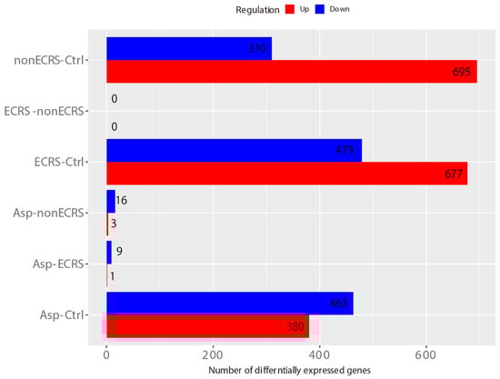DEGs in ECRS vs. control (ECRS-Ctrl), 677 upregulated and 479 downregulated; nonECRS vs Ctrl (nonECRS-Ctrl), 695 and 310; Asp vs Ctrl (Asp-Ctrl), 380 and 463; Asp vs nonECRS (Asp-nonECRS), 3 and 16; and Asp vs ECRS (Asp-ECRS), 1 and 9. No DEGs were identified in ECRS vs nonECRS (ECRS-nonECRS).