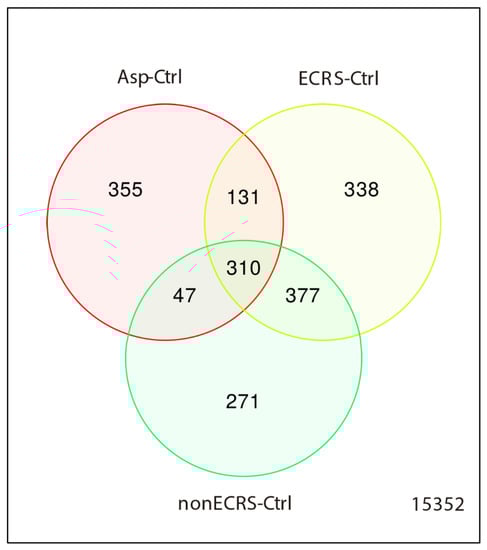 Venn diagram of all CRSwNP groups vs control. Specific DEGs were identified in each CRSwNP group as ECRS-Ctrl of 338, nonECRS-Ctrl of 271, and Asp-Ctrl of 355.