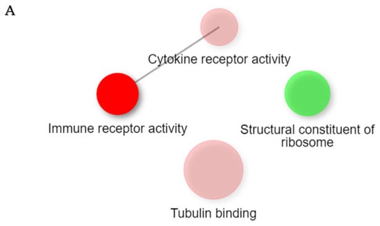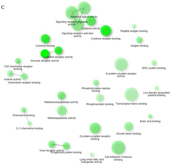 Pathway analysis with the GO molecular function with DEGs. ECRS-Ctrl (A), nonECRS-Ctrl (B), and Asp-Ctrl (C) showed the existence of significant enrichment pathways. Two pathways (nodes) are connected if they share 30% or more genes. Green and red represents down and up regulated pathways, respectively. Darker nodes show more significantly enriched gene sets. Bigger nodes represent larger gene sets. Thicker edges represent more overlapping genes.