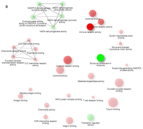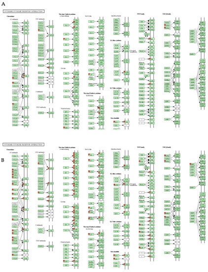 KEGG pathway analysis in “cytokine–cytokine receptor interaction” by DAVID for upregulated DEGs. Red stars represent the upregulated DEGs. Compared to cluster1-Ctrl (A) and cluster2-Ctrl (B), cluster2 was more upregulated for genes of the CC subfamily, CXC subfamily, gamma-chain utilizing, IL-4-like, IL6/12-like, IL-1-like cytokine, and TNF family.