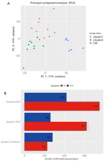 PCA analysis and DEGs of new clusters. (A) The new clusters showed clear separation from the control in PCA. (B) DEGs were identified not only for both cluster1-Ctrl and cluster2-Ctrl but also for cluster1-cluster2.