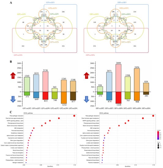 According to transcriptomic results, the differently expressed genes (DEGs) in each variety between two developmental stages were filtered by Fold Change (FC) > 2, p < 0.01. Venn plots were depicted in each variety among the six comparing groups comprising four stages (Figure 1A). Besides, the apparently up- and down-regulated DEGs were distinguished in Figure 1B. Fruits ripening obviously resulted in the upregulation of a large amount of DEGs as the latter stage generally held more abundant up-regulated DEGs than the previous stage. Comparatively, the increased effects on DEGs from fruit ripening were obvious in HP variety. KEGG enrichments were operated on the up-regulated DEGs in GP and HP, respectively (Figure 1C). The most abundant seven pathways were similarly enriched in both GP and HP, involving in plant hormones, phenylpropanoids, flavonoids, starch and sucrose. Besides, alpha-linolenic acid, linoleic acid metabolism, fatty acid elongation and diterpenoid biosynthesis that were related to volatiles formation were also identified.