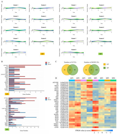 Screening of transcription factors (TFs). (A) Time cluster results in two varieties of young pomelo fruits. (B) TFs enrichments in specific clusters. In GP, clusters 2 and 7 were separately selected for enriching up- and down-regulated TFs during fruits development; In HP, clusters 1, 2 and 7were selected for enriching up-regulated TFs while clusters 3 and 9 were selected for enriching down-regulated TFs during fruits development. (C) Venn plots of the up- and down-regulated TFs in GP and HP varieties. (D) The FPKM values of TFs that belonged to the intersection of GP and HP varieties.
