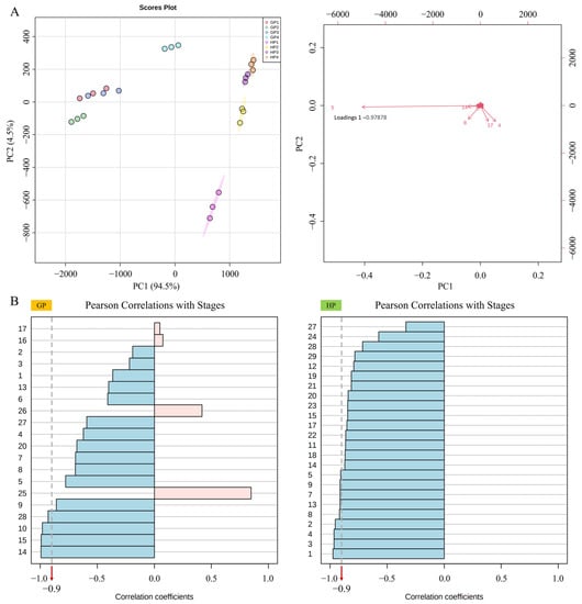 GC-MS/MS identified 29 volatile compounds in the present study (Table S2). Principal component analysis was conducted and results were shown in Figure 3A. PC1 and PC2 separately explained 94.5% and 4.5% of the variation, totally 99.0%. As the loadings results of volatiles shown, No. 5 volatile, diprene, held the negative correlation value with PC1 as −0.979, indicating the most negative relationship to PC1. Diprene was the most abundant volatiles in young pomelo fruits, as it comprised around 70–91% and 33–45% of the total volatile content in GP and HP, respectively. At stage 1, in GP, caryophyllene (around 11%) and beta-ocimene (around 8%) were the richest components following diprene, diversly, it was beta-myrcene (20–30%) and germanene D (10–20%) in HP. Figure 3B depicted the relationship between volatiles and time patterns, presented by coefficient values. The volatiles that varied negatively to developmental stages comprised a large proportion of the total. No. 9, 14 and 15 components separately referred to cosmene, caryophyllene and humulene which exhibited negative correlations with developing time in GP and HP varieties. Taking coefficient value −0.9 as the dividing benchmark, the number of volatiles that negatively correlated to the increasing development time in HP was larger than that in GP. Apart from the above-mentioned volatiles, trans-limonene oxide and hexadecanoic acid, methyl ester were prominently decreased in GP, while orthodene, beta-pinene, beta-phellandrene, beta-myrcene, diprene, trans-beta-ocimene, beta-ocimene, cosmene and linalool were distinguished in HP.