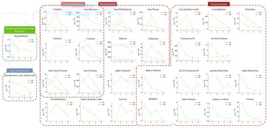 Hundreds of volatile compounds have been reported in citrus fruits, among which monoterpenes and sesquiterpenes are responsible for characteristic aroma []. In the case of our results, majority of volatiles were decreased during young pomelo fruits development. Caryophyllene and humulene exhibited negatively to time patterns both in GP and HP. In grape berries, alpha-humulene was one of the terpenes that characterized the early berries development, but benzene derivatives were predominant in later stages []. Mehta et al. identified the reductions of relative abundances of terpenes, including alpha-humulene and caryophyllene, when passing from the unripe to the half-ripe maturation stages in jambolana fruit []. Besides, unripe fruits possessed more volatiles than the fruits in half-ripe and ripe stages and the decreases of volatile compounds were detected during maturation []. These findings were consistent with our results, which also explained the mainstream changes of volatiles during young pomelo fruits development. In addition, it was reported in Citrus sinensis that cuticle thickness continuously decreased during the fruit maturation process []. Taking the predominantly accumulated volatiles in oil glands of peel into consideration [], during the development of young pomelos, the cuticle kept growing and relatively resulted in the reducing proportion of peel, hence terpenoids were detected with declinations.